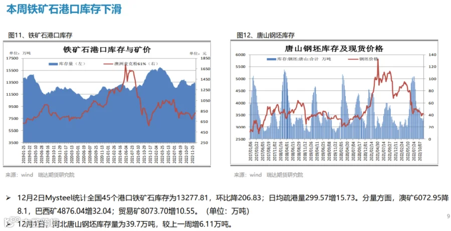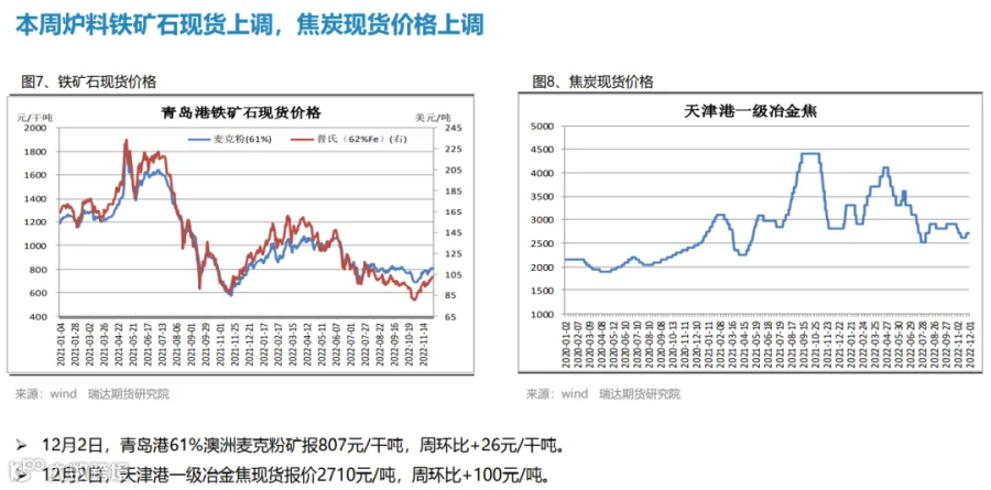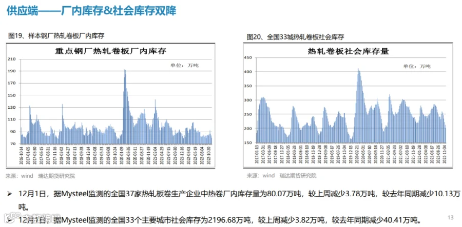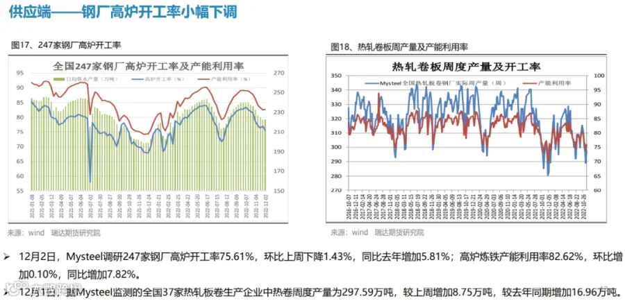 后市展望:供应端,本期热卷周度产量止跌回升,主要增幅是华北、华东地区轧机复产,供应量提升或削弱市场信心;需求端,厂内库存与社会库存继续下滑,年底赶工及刚需释放;最后,国内宏观面整体向好,对热卷价格仍有支撑作用。