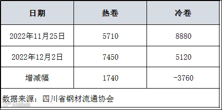 本周四川省钢材流通协会对样本钢厂关于板材出货量统计数据显示,热卷出货量7450吨,较上周增加1740吨。冷卷出货量5120吨,较上周减少3760吨。