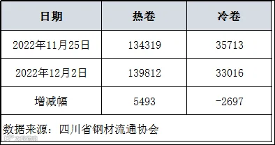 据四川省钢材流通协会统计,本周成都地区样本库房中热卷库存量为139812吨,较上周增加5493吨。冷卷库存量为33016吨,较上周减少2697吨。
