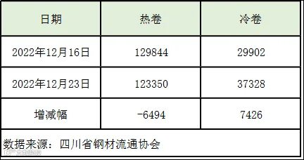 据四川省钢材流通协会统计,本周成都地区样本库房中热卷库存量为123350吨,较上周减少6494吨。冷卷库存量为37328吨,较上周增加7426吨。(板材库存采集的库房包括:国储437、中储天一库、达海)