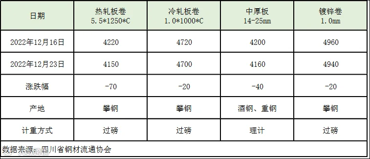 据四川省钢材流通协会对本周成都现货市场监测显示:热轧板卷较上周价格下跌70元/吨;冷轧板卷较上周价格下跌20元/吨;中厚板价格较上周价格下跌40元/吨;镀锌卷价格较上周价格下跌20元/吨持平。