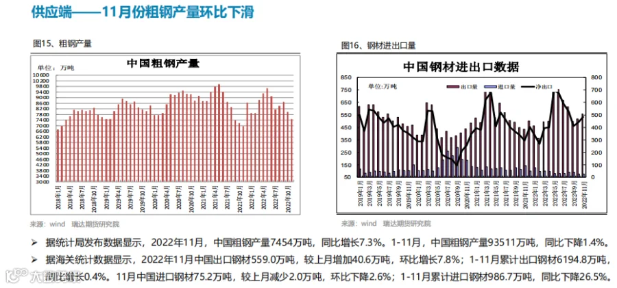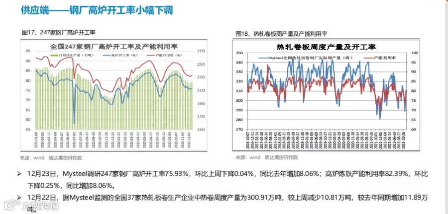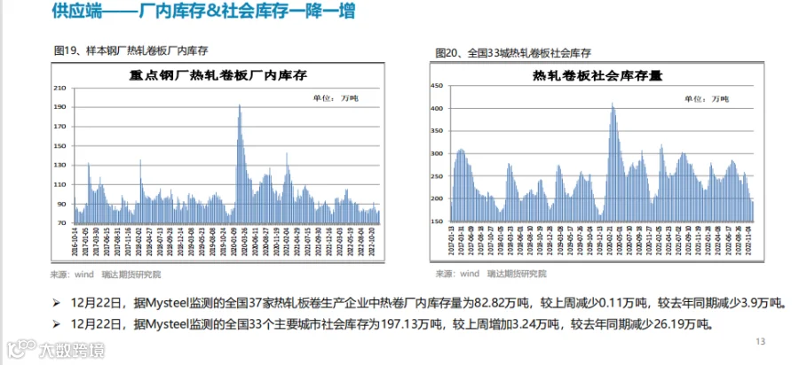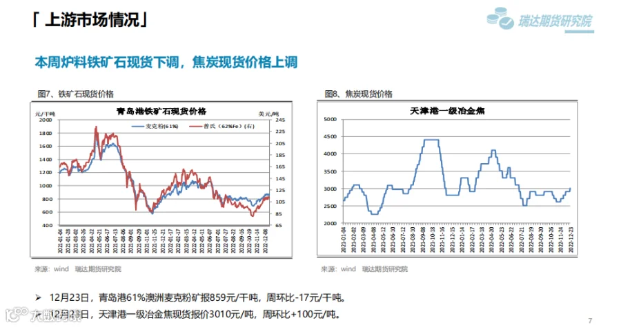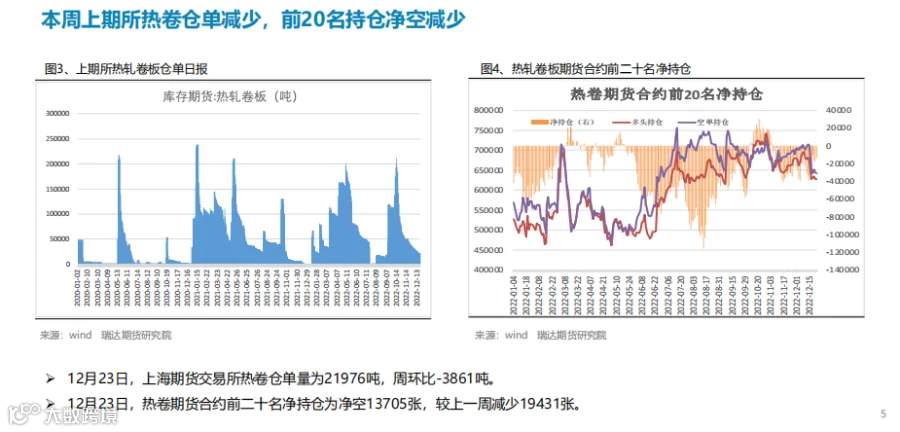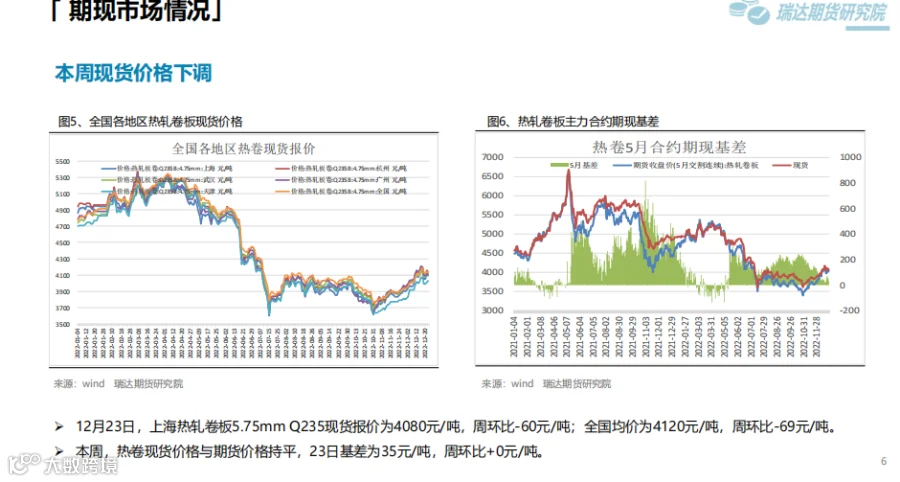后市展望:供应端,本期(12.16-12.23)热卷周度产量减少,因临近春节假期,部分检修,同时也受品种转产影响;需求端,厂内库存与社会库存一降一增,总量微增,表观消费量继续下滑。最后,国内宏观面整体向好,对热卷价格仍有支撑作用。