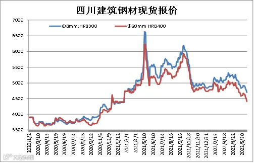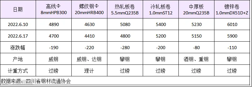 据四川省钢材流通协会对成都现货市场监测显示,本期建筑钢材价格大幅下调,美联储继续加息,货币收缩推高美元指数,大宗商品普遍承压,另外建筑钢材下游需求低迷,螺纹钢现货价格持续走弱。6月17日,成都地区Φ20mm HRB400螺纹钢价格为4410元/吨,较6月10日跌220元/吨;Φ8mm HPB300高线价格为4700元/吨,跌190元/吨。
