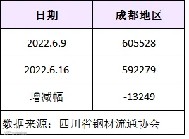 据四川省钢材流通协会统计,截止6月16日成都地区样本库房中螺纹钢及线材库存总量为592279吨,较上周减少13249吨,较去年同期增加163945吨。本期社会库存量有所回落,但仍高于去年同期,由于下游需求低迷,贸易商补库意愿不高,钢厂出库量减少。