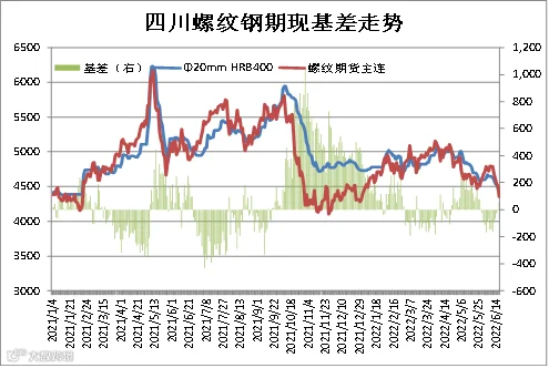 从近五年统计数据显示,成都建筑钢材现货价格与上期所螺纹钢期货价格存较强联动性,基差正常波动区间为0-400元/吨。本周现货价格强于期货,6月17日成都Φ20mmHRB400现货价为4410元/吨,RB2210合约期价为4354元/吨,基差为56元/吨,周环比+219元/吨。(备注:基差=现货-期货)