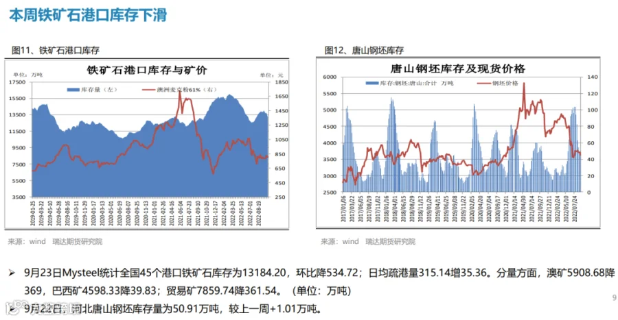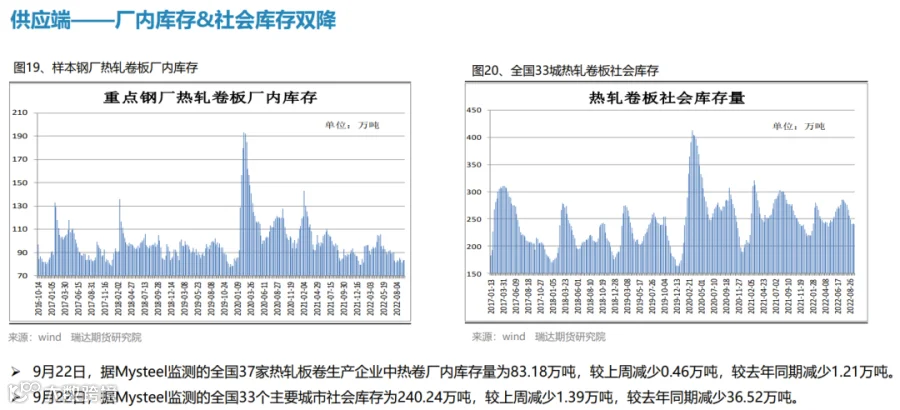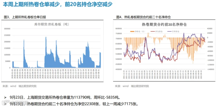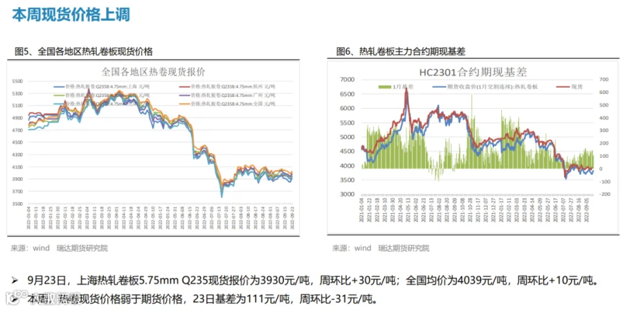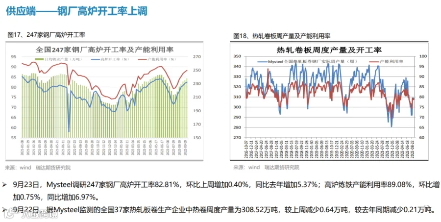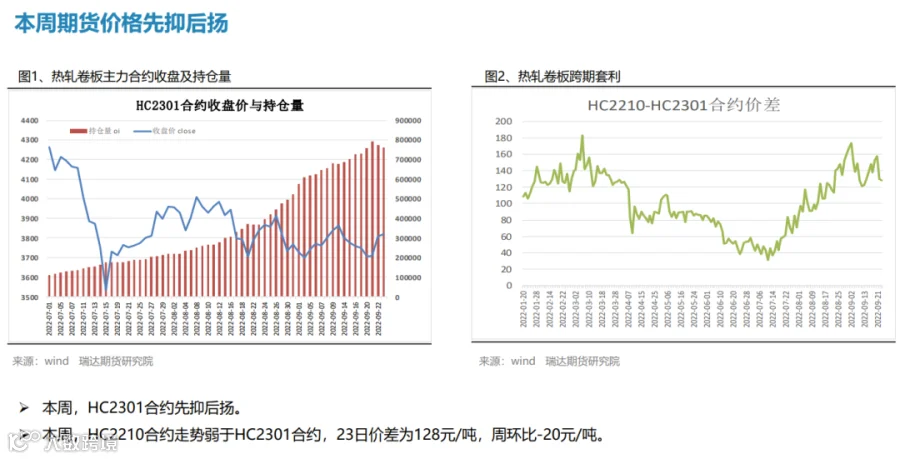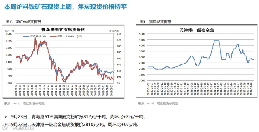 本周(9.16-9.23)热轧卷板价格先抑后扬。上半周走势疲软,因市场预期美联储将维持激进加息,市场情绪受挫,投机采购持续性不足,但随着周三晚美联储加息落地,市场空头情绪得到释放,叠加本期热卷周度产量及库存均出现下滑,支撑期价止跌反弹。下周(9.23-9.30)热卷价格或震荡偏强。供应端,热卷周度产量或维持在310万吨附近,产能利用率则维持在79%左右 。需求端,下游需求有所回暖,且下周为国庆节前最后一周,备库体量或比本周表现更明显,去库幅度或有扩大。最后,国内稳经济增长政策或继续提振市场信心。
