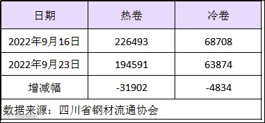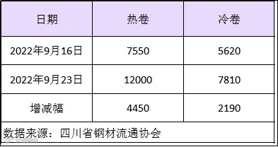 本周四川省钢材流通协会对样本钢厂关于板材出货量统计数据显示,热卷出货量12000吨,较上周增加4450吨。冷卷出货量7810吨,较上周增加2190吨。