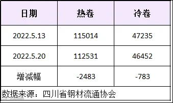 据四川省钢材流通协会统计,本周成都地区样本库房中热卷库存量为112531吨,较上周减少2483吨。冷卷库存量为46452吨,较上周减少783吨。