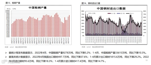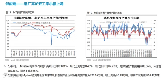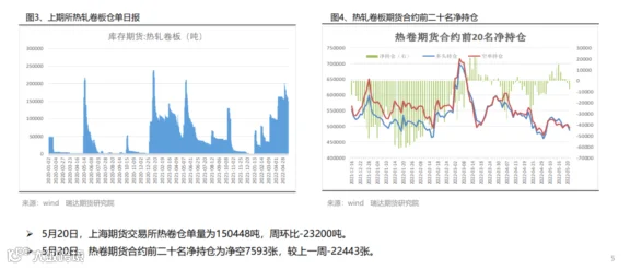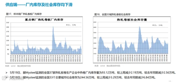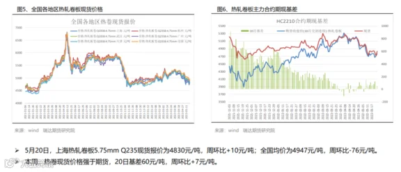 本周(5.13-5.20)热轧卷板价格先抑后扬。周初统计局公布的4月宏观数据及汽车家电产销量表现不佳,市场情绪受挫,叠加股市走弱拖累热卷期价,后半周受产量及库存下滑,同时6月份可能出台汽车下乡政策中国5年期LPR由4.6%下调至4.45%支撑,期价止跌反弹。下周(5.20-5.27)热卷价格或延续宽幅震荡。供应端,热卷周度产量小幅下滑,但产能利用率仍维持在83%附近,主要降幅地区是华东,由于钢厂主动检修、减产导致产量下降,但华北地区有新增钢厂复产,产量慢,但随着华东及东北疫情控制后需求或进一步释放,叠加汽车下乡预期也将一定程度上提振市场情绪。