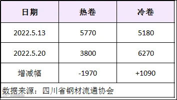 本周四川省钢材流通协会对样本钢厂关于板材出货量统计数据显示,热卷出货量3800吨,较上周减少1970吨。冷卷出货量6270吨,较上周减少1090吨。
