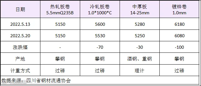 据四川省钢材流通协会对本周成都现货市场监测显示;热轧板卷较上周价格持平;冷轧板卷较上周价格下跌70元/吨;中厚板价格较上周下跌30元/吨,镀锌卷价格较上周价格下跌100元/吨。