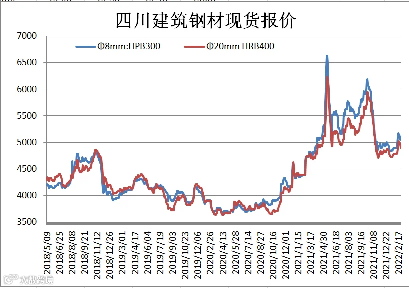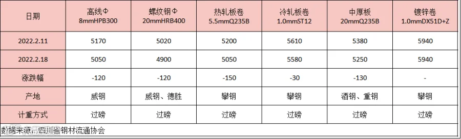 据四川省钢材流通协会对成都现货市场监测显示,本期(2.11-2.18)建筑钢材价格大幅下调,因节后终端需求释放缓慢,叠加监管部门加强原材料监管,炼钢成本下调,市场情绪转弱。2月18日,成都地区Φ20mm HRB400螺纹钢价格为4900元/吨,较2月11日跌120元/吨;Φ8mm HPB300高线价格为5050元/吨,跌120元/吨。