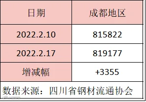 据四川省钢材流通协会统计,截止2月17日成都地区样本库房中螺纹钢及线材库存总量为819177吨,较上周增加3355吨,较去年同期减少336974吨。本期库存量继续增加,省外资源到货一般,但川内钢厂复产增多供应增加。