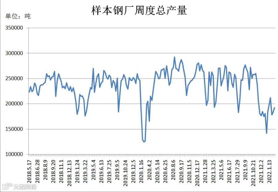 (2月11日-2月17日)四川省钢材流通协会对四家样本钢厂关于建材产量统计数据显示,本周A、B、C较上周分别减少2000吨、3252.27吨、4000吨;D较上周增加18200吨。四家样本钢厂总产量为192085吨,周环比增加8948吨。