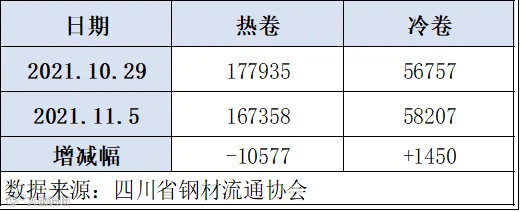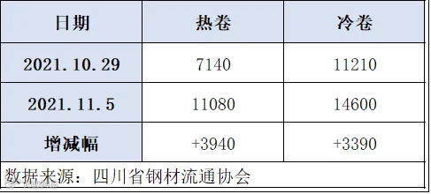 本周四川省钢材流通协会对样本钢厂关于板材出货量统计数据显示,热卷出货量11080吨,较上周增加3940吨。冷卷出货量14600吨,较上周增加3390吨。