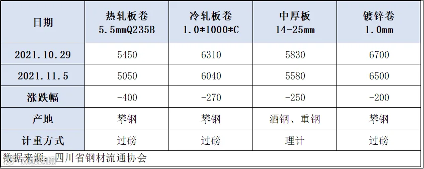 据四川省钢材流通协会对本周成都现货市场监测显示;热轧板卷较上周下跌400元/吨;冷轧板卷较上周价格下跌270元/吨;中厚板价格较上周下跌250元/吨;镀锌板价格较上周下跌200元/吨。