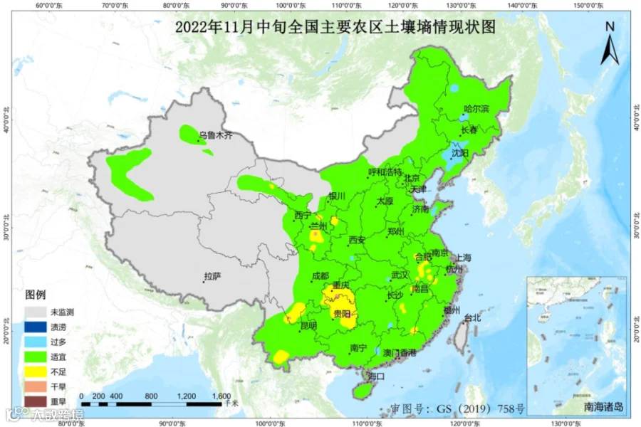 据全国农田土壤墒情系统监测,2022年11月17日,华北黄淮麦区大部0—20cm土壤平均相对含水量75.6%,土壤墒情适宜,利于冬小麦幼苗生长;西北麦区0—20cm土壤平均相对含水量为68.2%,墒情总体适宜;长江中下游和西南麦区大部墒情适宜,四川、重庆局部和皖南丘陵地区墒情不足。下面以西北麦区为主要分析案例: