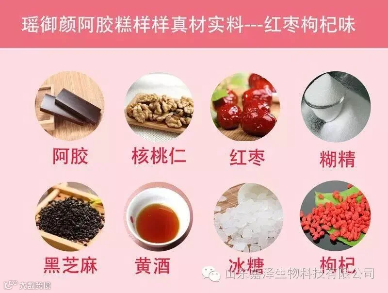 2、红枣枸杞口味:秉承经典、勇于创新,严格选材,精心熬制,由上等东阿阿胶、黑芝麻、核桃仁、红枣、枸杞、黄酒、冰糖、糊精秘制配方纯手工制作而成。