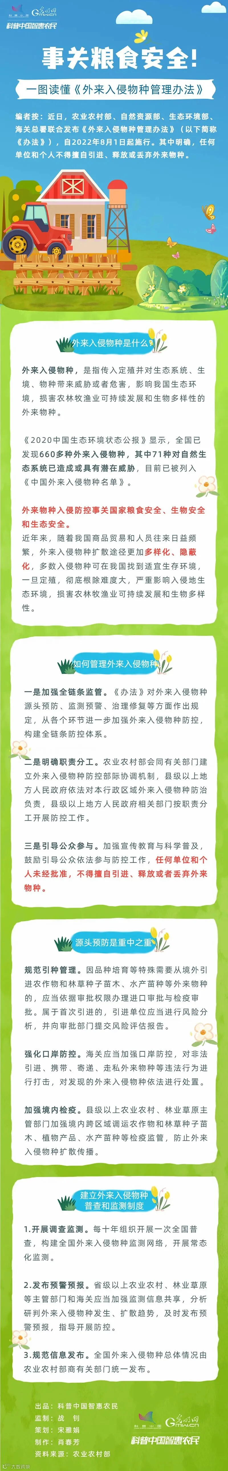 外来物种入侵防控事关国家粮食安全、生物安全和生态安全。近年来,随着我国商品贸易和人员往来日益频繁,外来入侵物种扩散途径更加多样化、隐蔽化,多数入侵物种可在我国找到适宜生存环境,一旦定殖,彻底根除难度大,严重影响入侵地生态环境,损害农林牧渔业可持续发展和生物多样性。2020年10月17日公布、2021年4月15日起施行的《中华人民共和国生物安全法》明确规定,“国家加强对外来物种入侵的防范和应对,保护生物多样性。国务院农业农村主管部门会同国务院其他有关部门制定外来入侵物种名录和管理办法”。为切实加强外来入侵物种管理,农业农村部会同自然资源部、生态环境部、海关总署,系统梳理国内外相关立法情况,深入开展专家研讨和实地调研,广泛听取有关部门、行业专家和社会公众意见,在此基础上研究制定了《办法》。