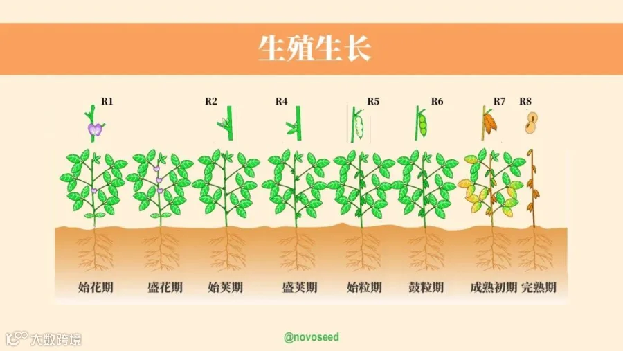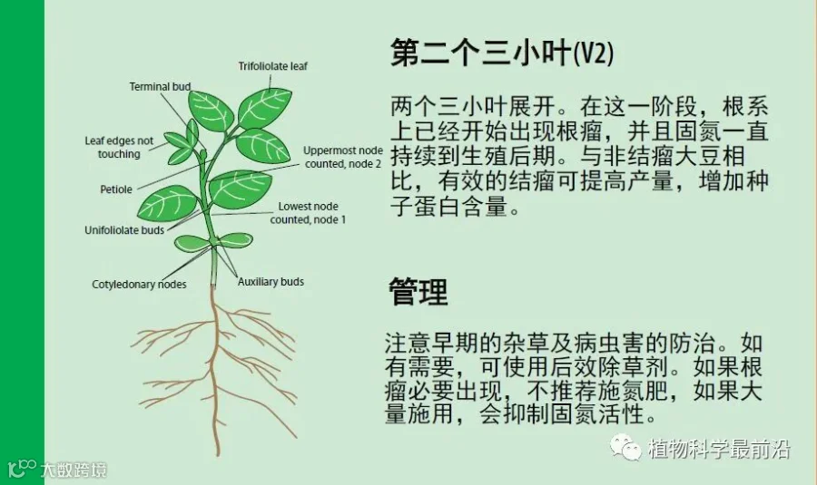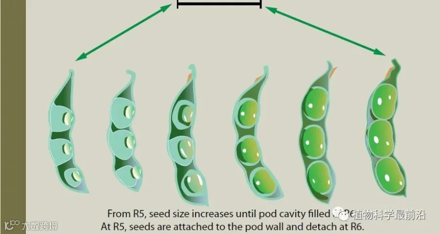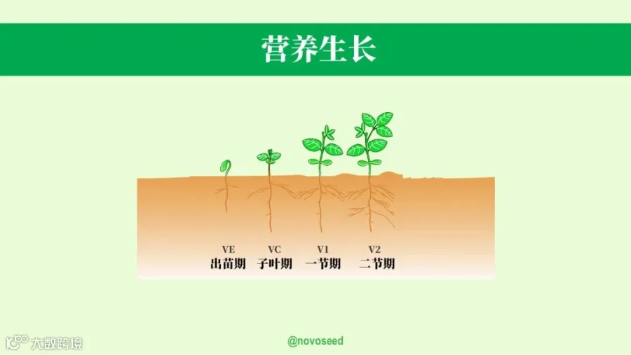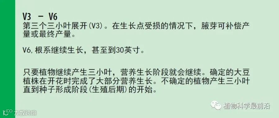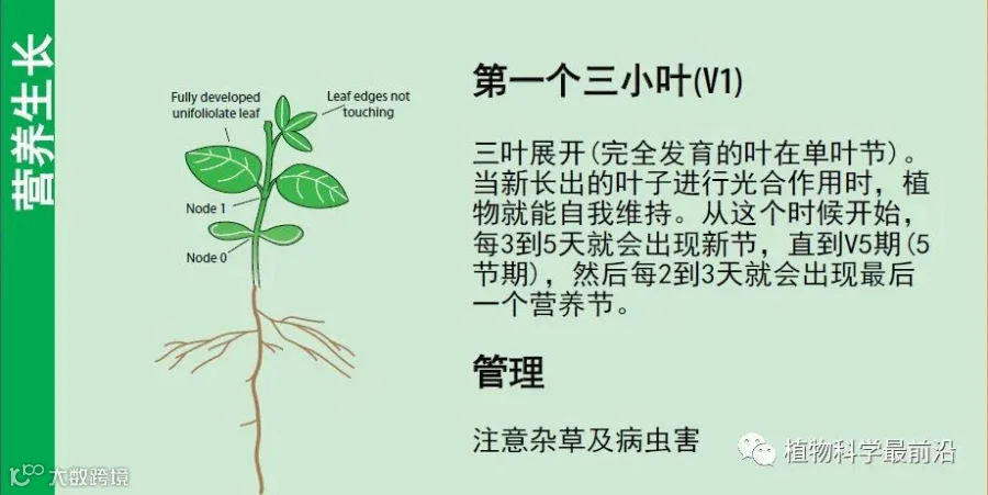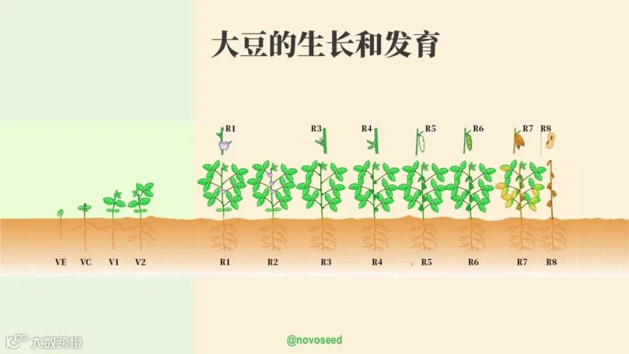 1977 年,Fehr提出大豆生育时期的鉴定方法。他把大豆的生育过程划分为营养时期(V)和生殖时期(R)。每个时期内又细分为若干个时期。营养时期以主茎上的节数划分时期。只有那些具有充分生长的叶片的节位才被计数。确定某个节位是否被计数,主要根据和它相邻的上位叶的小叶片是否展开。如上位叶的小叶片的叶缘已分离呈半展开状,则该叶片被认为是充分生长的叶,该叶着生的节位可被计数为营养时期的节数。如上位叶的小叶片的叶缘未分离,则该叶片被认为是未充分生长的叶,其下位叶着生的节位可被计数为营养时期的节数。