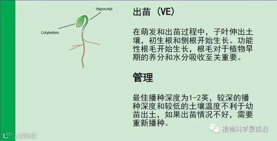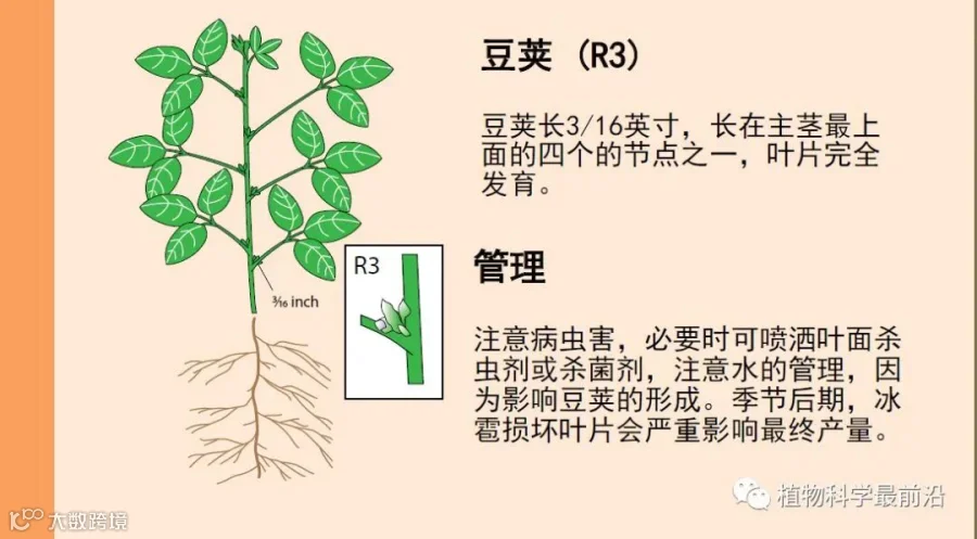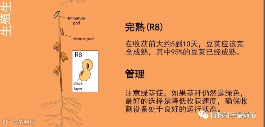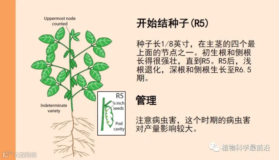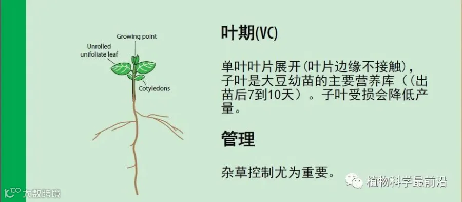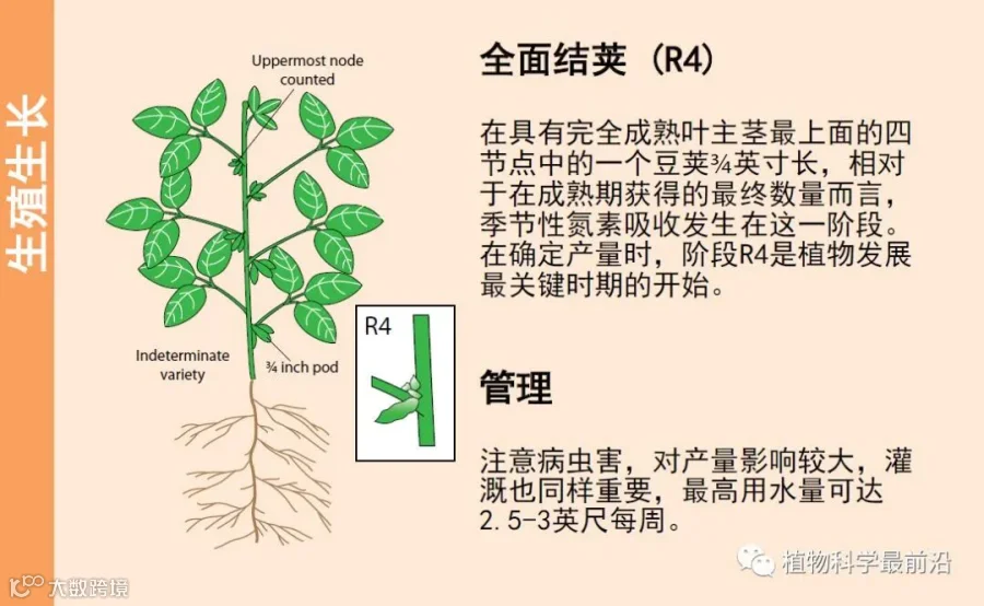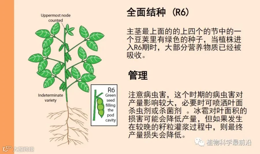 1977 年,Fehr提出大豆生育时期的鉴定方法。他把大豆的生育过程划分为营养时期(V)和生殖时期(R)。每个时期内又细分为若干个时期。营养时期以主茎上的节数划分时期。只有那些具有充分生长的叶片的节位才被计数。确定某个节位是否被计数,主要根据和它相邻的上位叶的小叶片是否展开。如上位叶的小叶片的叶缘已分离呈半展开状,则该叶片被认为是充分生长的叶,该叶着生的节位可被计数为营养时期的节数。如上位叶的小叶片的叶缘未分离,则该叶片被认为是未充分生长的叶,其下位叶着生的节位可被计数为营养时期的节数。