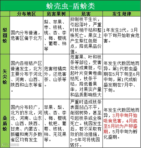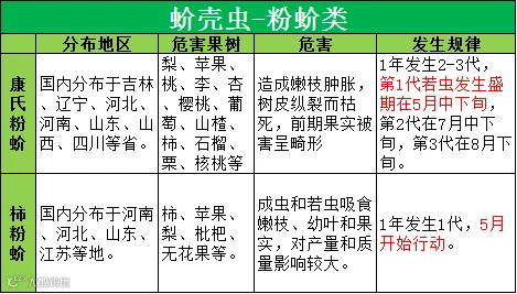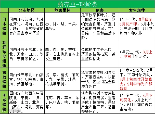 (注意:地区不一样,发生的时间也会不一样,具体时间还是要根据地区而定。)在球蚧类蚧壳虫中,朝鲜球坚蜡蚧、褐盔蜡蚧3月开始活动,危害的作物有桃、杏、李、樱桃、葡萄、梨、苹果等。枣球蜡蚧4月下旬羽化,危害的作物有枣、杏、苹果、梨、桃、葡萄等,大家要注意预防时间!