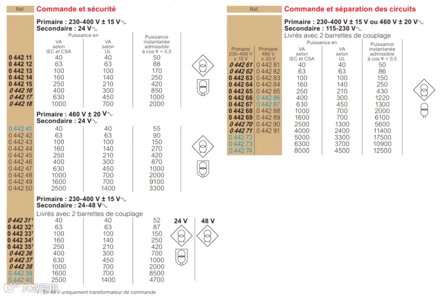 • Primaire 230V-400V+/- 15V~ – Secondaire 24V~ – IP2x ou xxB sans barrette de couplage jusqu’à 400VA – IPxxA au-delà de 400VA – IK04 – Parties actives protégées par capot jusqu’à 1000VA