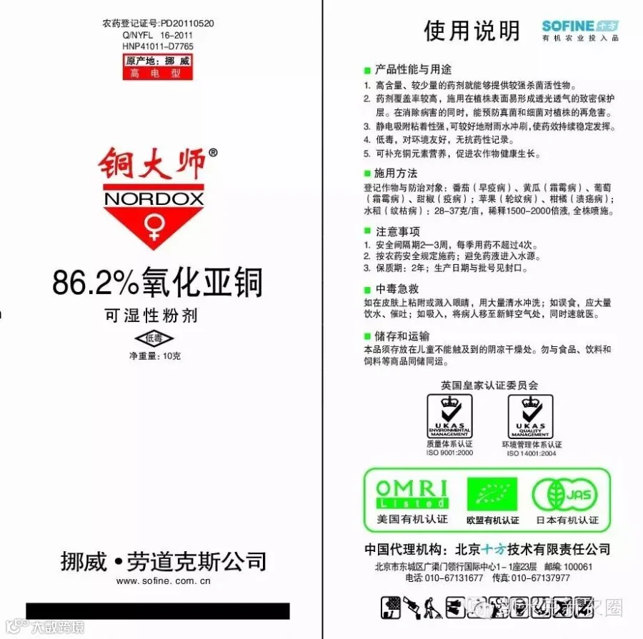 铜大师是挪威--劳道克斯公司(NORDOX)生产的一种保护兼治疗的广谱性无机铜杀菌剂,适用于防治果树、蔬菜、粮食等作物的真菌性和细菌性病害。