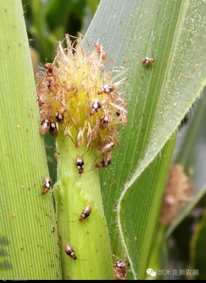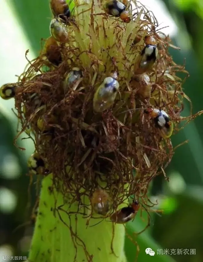 1、该虫以成虫群集危害,主要危害玉米叶片,成虫取食叶肉,残留不规则白色网状斑和孔洞,严重影响光和作用,8月份咬食玉米雌穗花丝,影响授粉。也可取食灌浆期的籽粒,引起穗腐。危害严重时可造成大面积减产,甚至绝收。