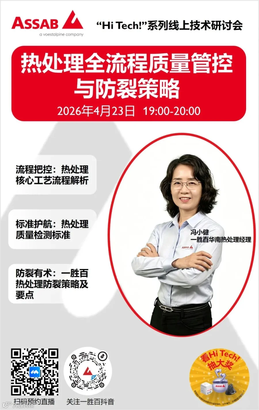 4月23日的一胜百"Hi Tech!"线上技术研讨会,将直面这一关键工艺,系统揭示其技术内核。本期直播由一胜百华南热处理经理冯小健主讲,通过热处理的核心工艺流程、质量检测标准以及一胜百热处理防裂策略的关键要点,多维度探讨高品质热处理的至关重要性。