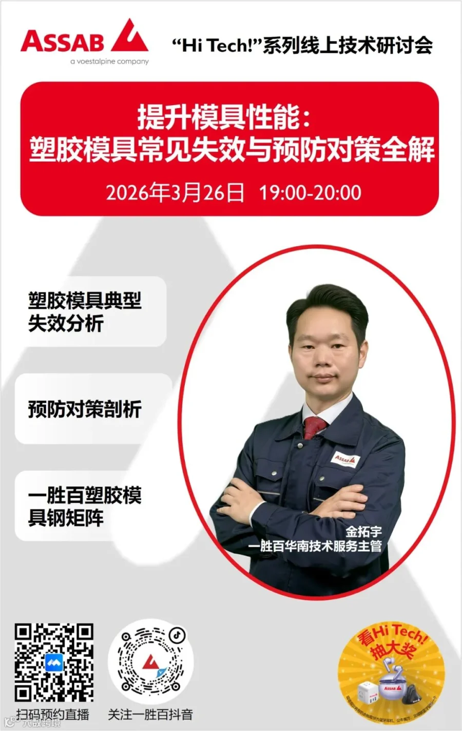 3月26日开播的"Hi Tech!"线上技术研讨会,将由一胜百华南技术服务主管金拓宇开讲,聚焦塑胶模具中典型失效模式,结合一胜百丰富且独特的塑胶钢产品,为您献上失效预防宝典。