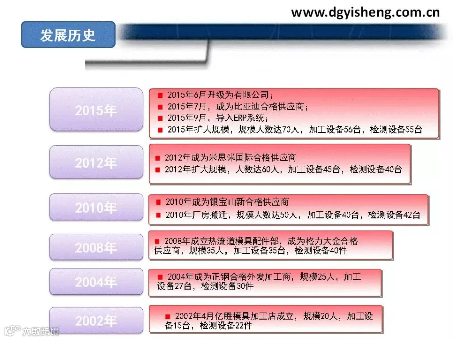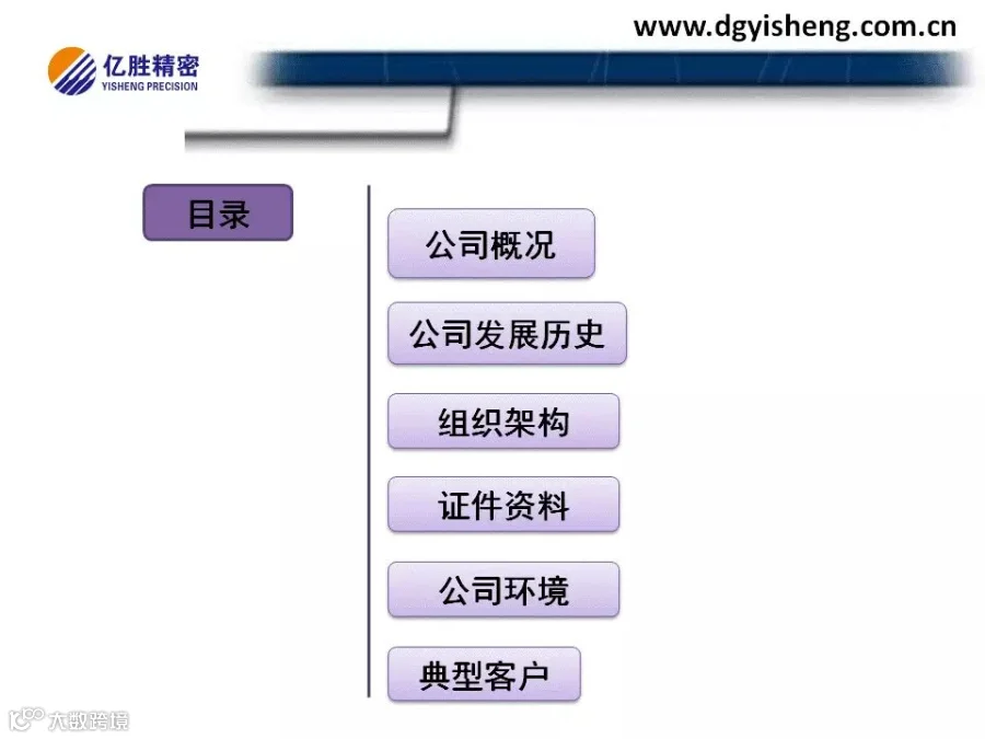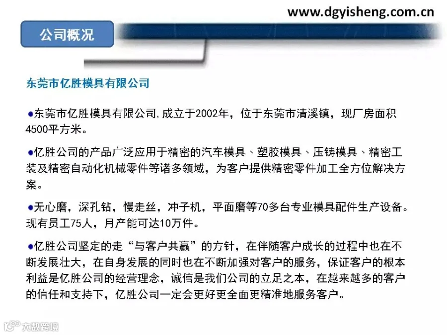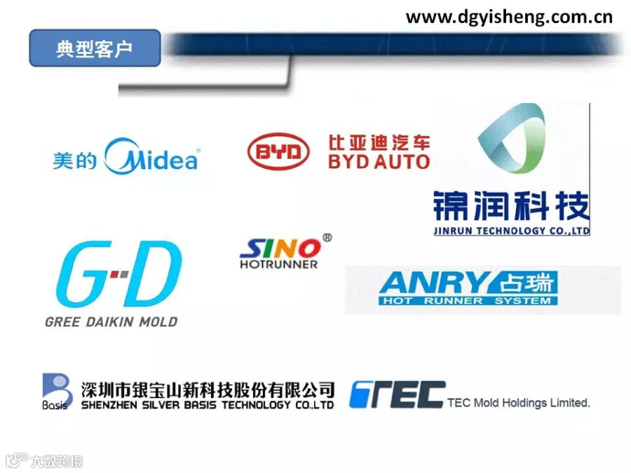 亿胜公司的产品广泛应用于精密的汽车模具﹑塑胶模具﹑压铸模具﹑热流道配件及精密自动化机械零件等诸多领域,为客户提供精密零件加工全方位解决方案。产品主要有:司筒、顶针、顶杆、镶件、阀针/套等...