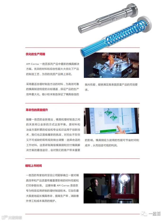 对客户而言,一胜百和Uddeholm的最新产品是对客户更好业务发展和发挥无限生产潜力的承诺。对公司而言,这是近350年的经验积累和市场领先的冶金新技术。从研发到测试,我们始终围绕客户的需求和公司的质量标准来设计产品。AM Corrax 可以帮助我们巩固全球领先的模具钢解决方案供应商地位,还为制造商提供了在金属打印实现巨大飞跃的机会。为了与公司在新专业领域所取得的大好形势齐头并进,我们必须以一个全新的视角审视增材制造加工。全球一流的冶金专家和领域专家通过不懈努力,为应对具有挑战性的形状和苛刻的需求带来了卓越的解决方案。AM Corrax 是首款专为模具而研发的 AM(增材制造) 粉末。