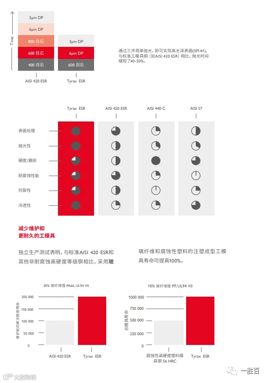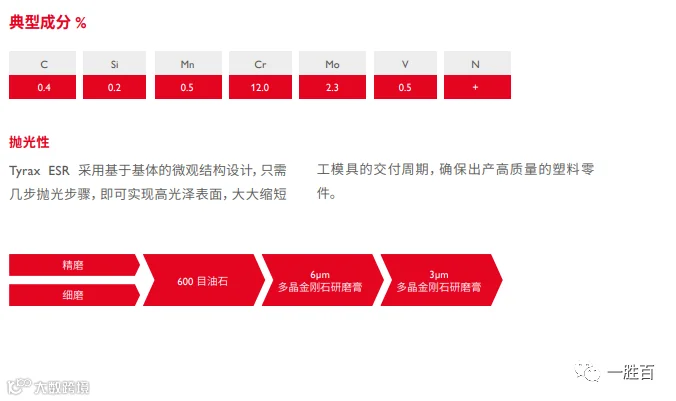 若以塑料产品质量为重,则应避免牺牲工模具钢质量,从而降低生产风险。对于侵蚀性塑料材料,Tyrax ESR具有最佳的耐腐蚀和耐磨性组合特性。在不牺牲表面光洁度的前提下,确保侵蚀性塑料生产的安全稳定。选用Tyrax ESR,您无需做出任何妥协,因其抛光性能远胜同类产品。