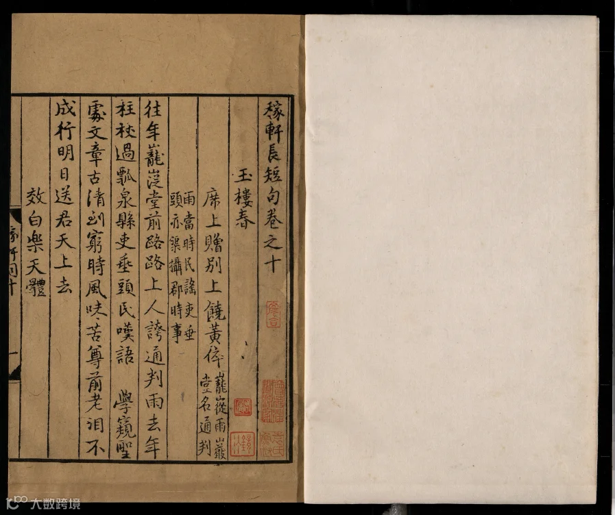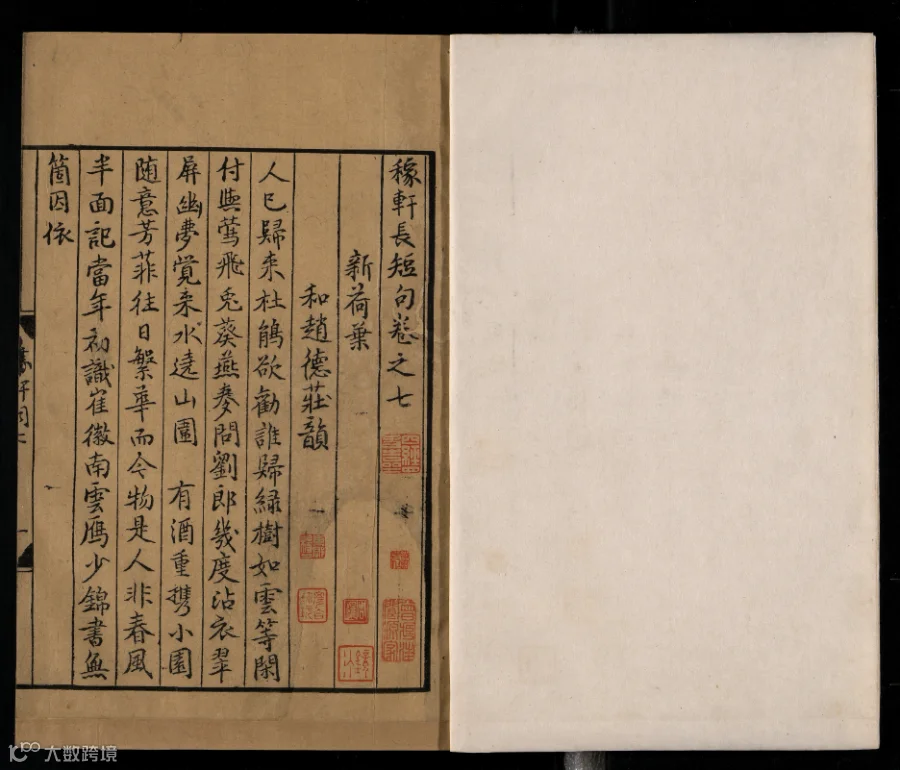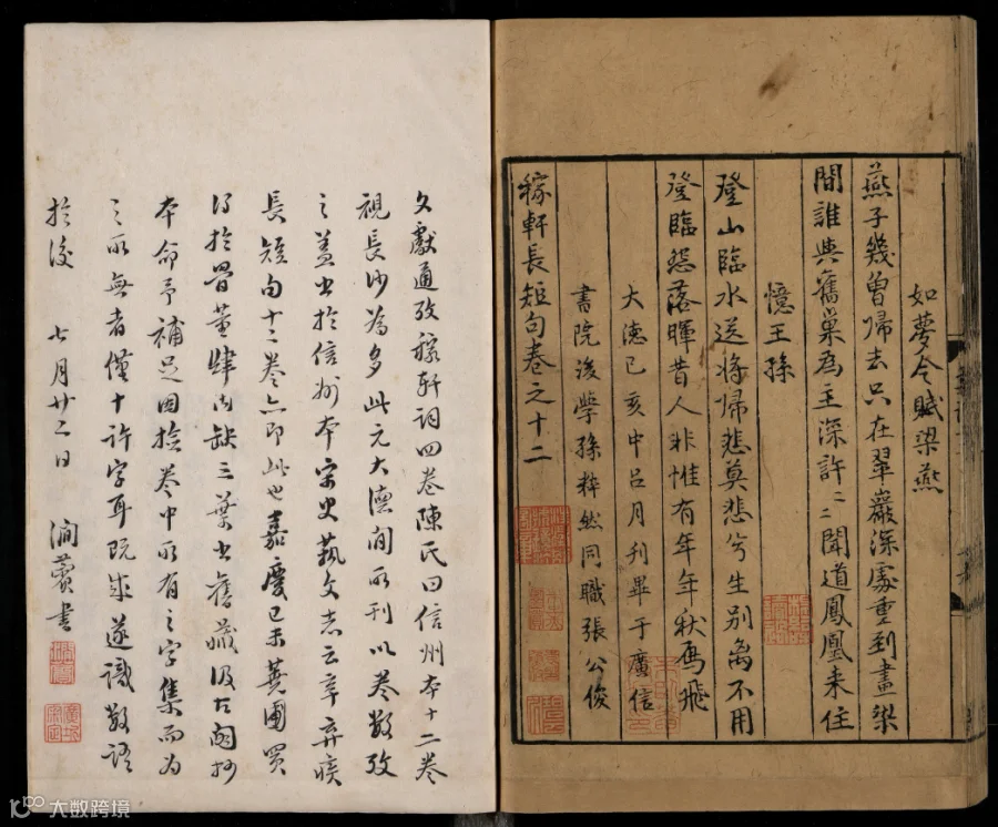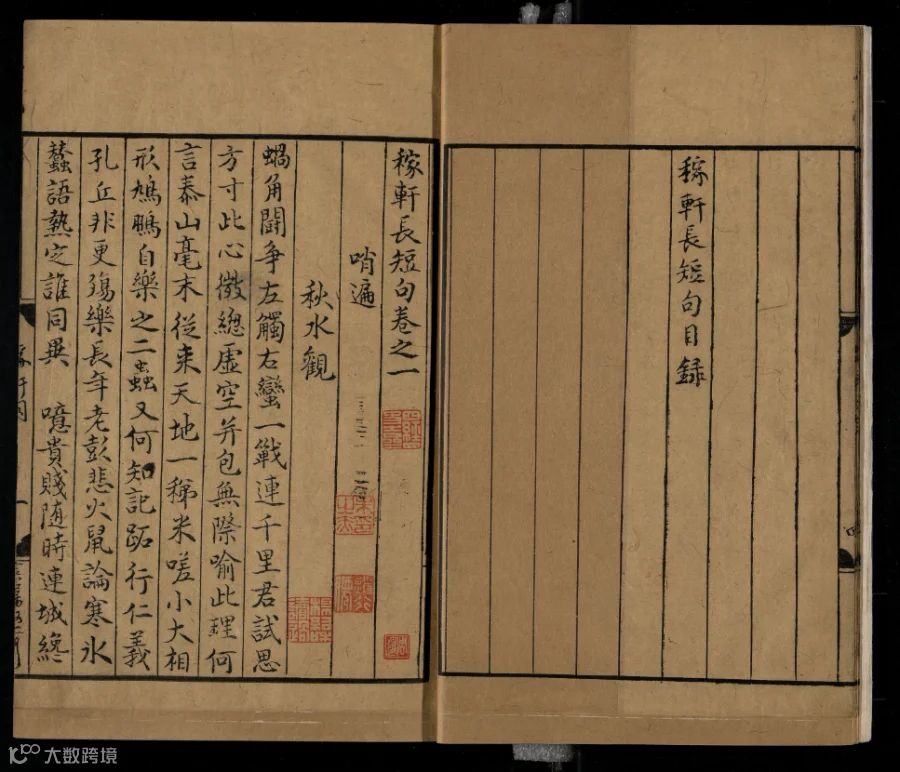 《宋史•艺文志》着录有“辛弃疾长短句十二卷”,《直斋书录解题》亦着录有稼轩词四卷,又信州本十二卷。而宋代信州本不传,此广信书院刻本,疑为覆刻宋信州本。此十二卷本流传比较广。明嘉靖十五年(1536)王诏刻《稼轩长短句》十二卷,嘉靖二十四年(1545)何孟伦刻《辛稼轩词》十二卷,皆出自此本,明末汲古阁刻《六十名家词》中《稼轩词》虽并为四卷,而编次与信州本同,亦根据嘉靖本覆刻。由此可见此元本渊源之古,文物和文献数据价值之高。