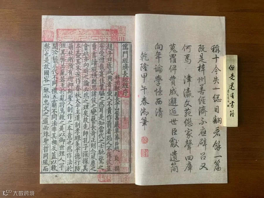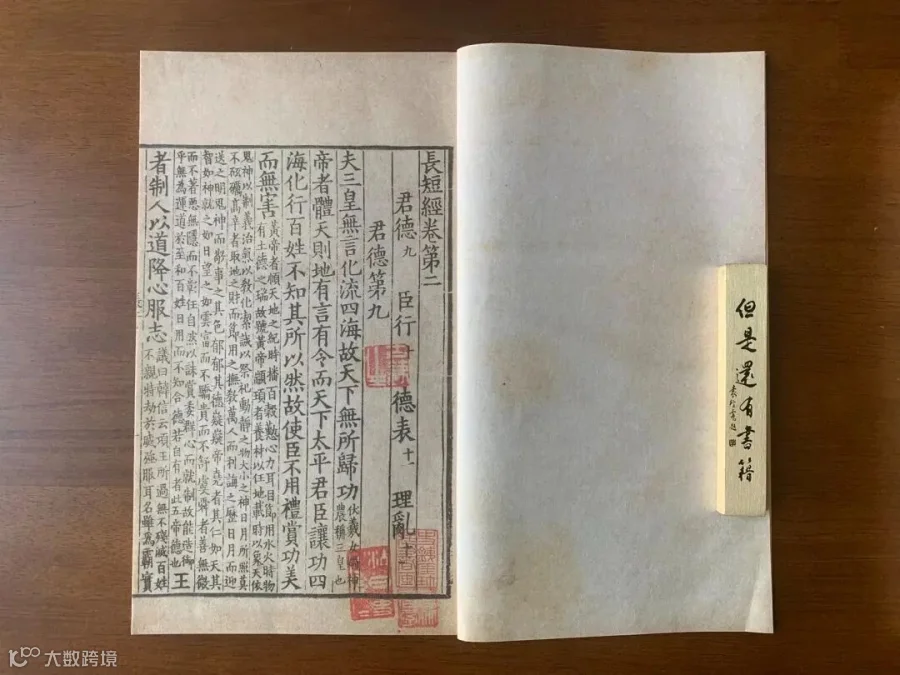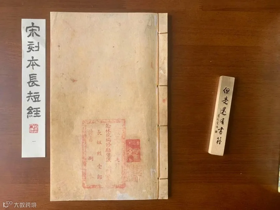 乾隆时纂修《四库全书》,励守谦任四库馆编修,故进呈是本,录副后又返归励氏收藏。书衣有“乾隆三十八年(1773)七月,翰林院编修励守谦送到家藏《长短经》一部计书八本”戳记,又钤盖满汉文“翰林院印”一印,知即为四库进呈纂修底本。卷首副叶有乾隆御题,末署“乾隆甲午(1774)春御笔”,钤“乾隆御览之宝”一印和“乾”“隆”连珠印。其中有两句是“宋刊弆自教忠堂,通变称经曰短长”,“卷原称十今失一,总目翻看余一篇”。“教忠堂”为励守谦堂名。据乾隆三十九年谕称:“其进书百种以上者,并命择其中精醇之本,进呈乙览,朕几余亲为评咏,题识简端。”又称:“又进书一百种以上之江苏周厚堉……及朝绅中黄登贤、纪昀、励守谦、汪如藻等,亦俱藏书旧家,并著每人赏给内府初印之《佩文韵府》各一部,俾亦珍为世宝,以示嘉奖。”励守谦家进呈达一百余种,故该本得乾隆御题。录副本即四库底抄本,归王懿荣所得(据《增订四库简明目录标注》),而宋刻原本则从励氏手中流出转转归常熟翁同龢所藏。最早透露此线索者即为王懿荣,他说:“常熟翁氏有宋刻本,不知所佚之一卷(即卷十)存否?”(据《增订四库简明目录标注》)所钤“虞山翁同龢印”“均斋祕笈”即为其藏印。书末副叶除沈跋外,并记“戊午夏五月重装”,“戊午”疑为咸丰八年(1858),待考。又记“光绪廿六年(1900)四月廿四日钱唐汪鸣銮、武进费念慈同观。是月携宋本《周官》郑注、《吴郡图经续记》《参寥子集》开几快览,念慈题记”。此时翁同龢已被清廷革职永不叙用,闲居常熟家中,故观此本当即在翁同龢宅中。翁同龢卒后藏书归翁之廉,因翁之廉无子嗣而过继翁之熹之子翁万戈,故又归翁万戈所藏,所钤“翁万戈藏”即为其印。20世纪40年代,翁万戈将包括此宋本《长短经》在内的翁家所藏精华携至美国,至2000年方由上海图书馆购归。