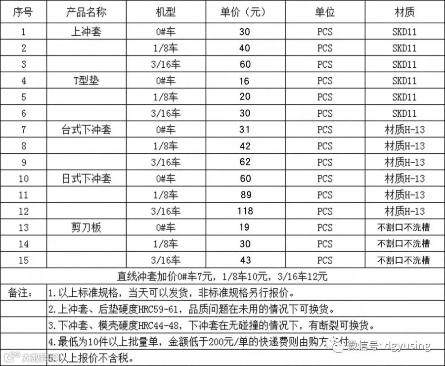 导读:螺丝机上冲套,下冲套,日式冲套,0#机-3/16车冲套价目表,可来图来样,根据客户规格尺寸非标定做,咨询热线18929280654彭生