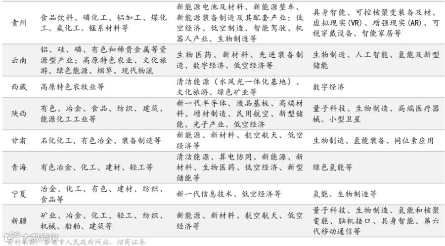 西部省份的发展策略紧密结合其丰富的能源、矿产与生态资源,瞄准绿色能源、算力基础设施等国家战略需求,将资源优势转化为产业优势和经济优势。 同时,依托 “ 东数西算”等国家工程,积极承接东部算力需求,发展特色数字产业和资源精深加工产业。 比如,贵州省提出深入实施 “ 东数西算”工程,优化调整“算力券”政策,将算力优势转化为产业优势,同时着力做优做强酸汤、刺梨、抹茶、中医药等极具地方特色的生态产业,推动资源优势向价值链高端延伸。