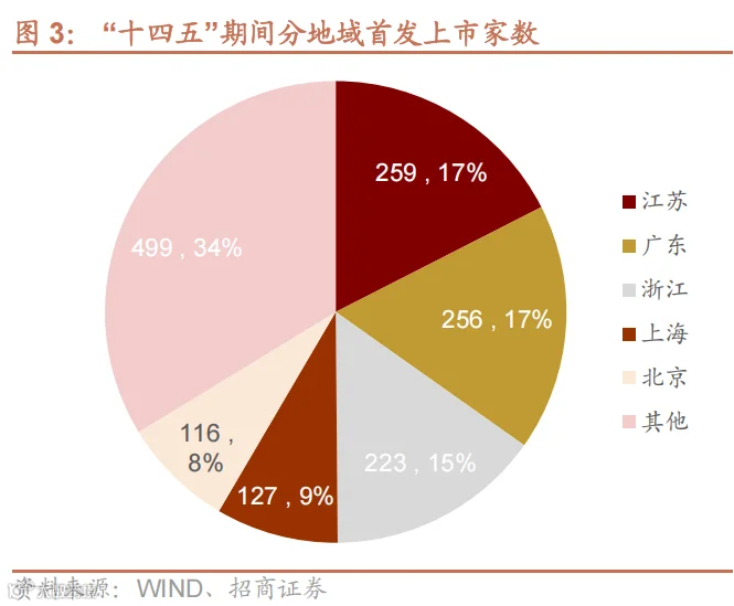 区域集中化: 东部省份领跑。上市与再融资活动高度集中于北京、广东、江苏、上海、浙江等经济发达地区。 以首发上市为例,江苏( 259 家 )、广东( 256家)、浙江(223 家)、上海( 127 家)、北京( 116 家)合计占比超 66%,反映区域经济实力与产业基础对资本市场融资能力的支撑。