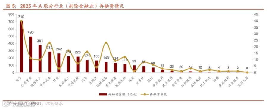 再融资市场:增发为主,工具创新突破。2025 年 A 股再融资规模达9508.65 亿元,其中增发占比 93.36%( 8877.32 亿元)。从募资金额来看,银行业以 5200亿元领跑,电子行业以 710 亿元位列第二;从募资项目个数来看,电子行业以40 个居首,电力设备、机械设备、基础化工、汽车行业紧随其后 ,反映传统行业补充资本与新兴行业扩张需求并存。2025 年 6 月,保利发展发行市场首单现金类定向可转债,标志着定向可转债从并购支付工具拓展至再融资领域,为房企及重资产行业提供新融资渠道。北交所同步跟进,优机股份定向可转债发行实现 “破冰”,预计定向可转债将逐步成为上市公司常态化融资工具。此外, “储架发行”制度择机推出,进一步提升再融资效率。