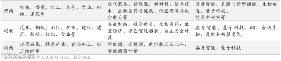 中部省份立足承东启西的区位和工业基础,产业策略的核心是在巩固传统优势产业基本盘的同时,于装备制造、 电子信息等领域寻求突破,培育具有全国影响力的先进制造业集群。其发展强调 “提质”与 “补链”,通过技术改造推动传统产业焕新,并深度对接国家战略,打造新兴支柱产业。 比如,河南省明确提出深度对接国家新一轮重点产业链高质量发展行动,支持新型电力装备、现代食品等产业进入国家先进制造业集群,在创新投入上设定硬性指标,计划实现全社会研发经费投入年均增长 10%以上,战略性新兴产业增加值占规上工业比重达到 30%。湖北省的现代化产业体系构建则体现了鲜明的“三维并进” 思路:加快汽车、钢铁、化工等传统产业改造升级; 大力发展集成电路、航空航天、生物医药等新兴支柱产业;同时前瞻布局具身智能、量子科技、6G 等未来产业。此外,湖北正着力建设武汉、宜昌、“襄十”三大算力圈,为数字经济发展筑牢底座。江西省则聚焦于建设中部地区特色装备集聚区,加快发展生物医药、低空经济等产业,并通过加快打造“赣鄱氢走廊”、“赣鄱空中走廊”,在新能源与低空经济新赛道上形成特色优势。