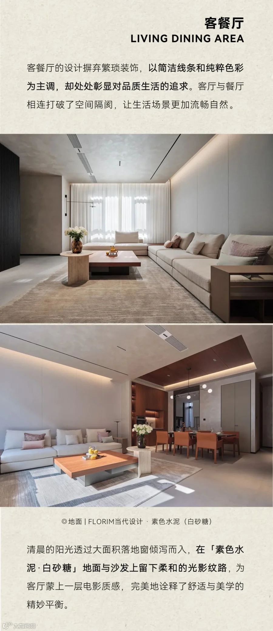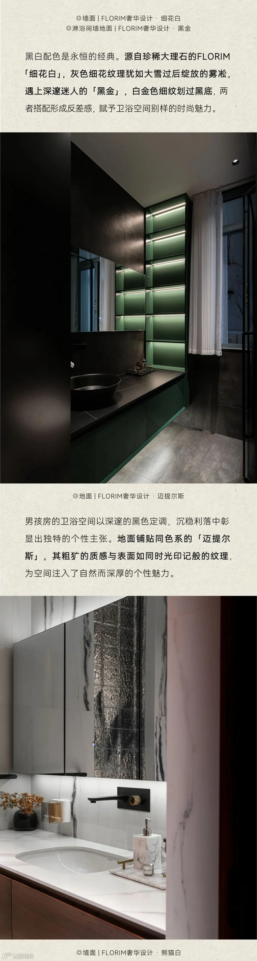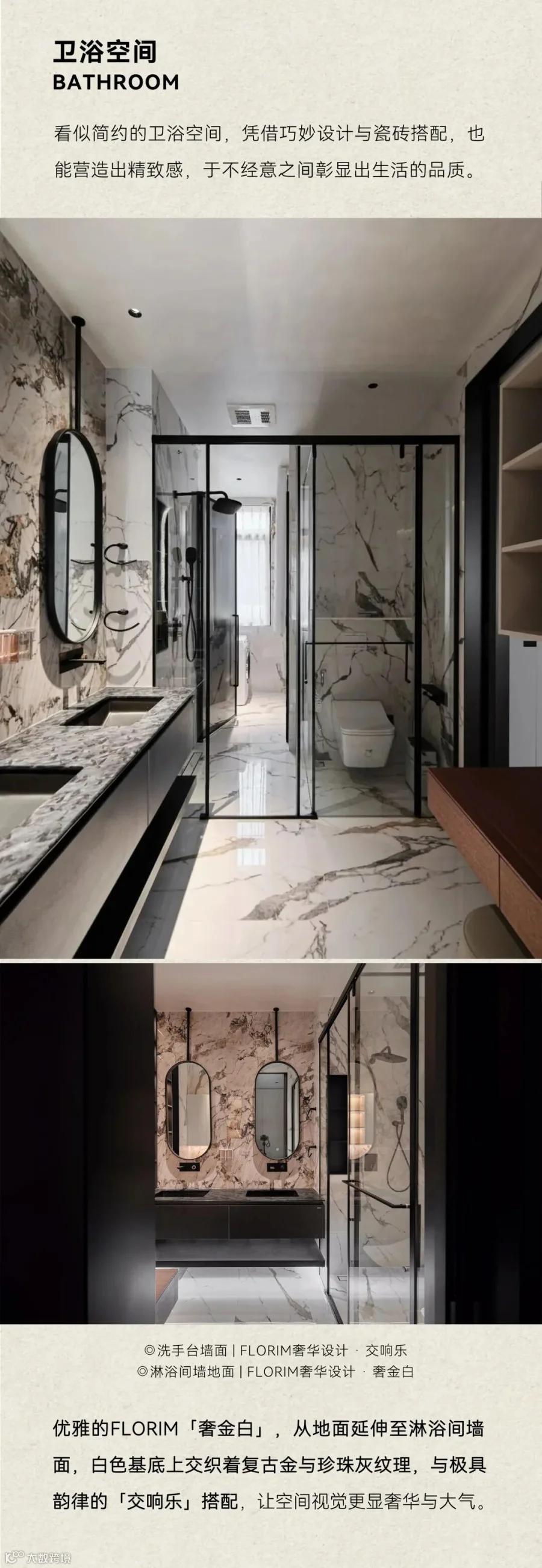这是一栋上下四层带花园的430m别墅。设计师从屋主的品味中汲取灵感,塑造理想生活,整体设计简约大气,于细节中藏纳奢华,诠释了当代高阶生活的从客与优雅,以简奢美学演绎生活的理想居所。材料,是表达空间情感的密码。该案例地面大部分选用FLORIM「欧洲印象」铺贴,浅淡灰白的色调,随天然斑驳的肌理悄然延伸,为空间注入细腻层次与宁静氛围。清晨的阳光透过大面积落地窗倾泻而入,在灰白色的地面与沙发上留下柔和的光影纹路,把素雅的客厅蒙上一层电影质感,完美地诠释了舒适与美学的精妙平衡。厨房以纯净的白色调进一步强化极简主义的美学理念,白色的橱柜线条利落,搭配FLORIM「特级雪花自」背景,灰色的脉络在白色基底上肆意延展,为空间增添了一份灵动与随性,打破了纯色可能带来的单调感。优雅的FLORIM「奢金白」,从地面延伸至淋浴间墙面白色基底上交织着复古金与珍珠灰纹理,与极具韵律的FLORIM「交响乐」搭配,让空间视觉更显奢华与大气。黑白配色是永恒的经典。源自珍稀大理石的FLORIM「细花白」,灰色细花纹理犹如大雪过后雾凇的绽放,遇上深邃迷人的FLORIM「黑金」,白金色细纹划过黑底两者搭配形成反差碰撞,赋予空间别样的时尚魅力。郑州·理想国