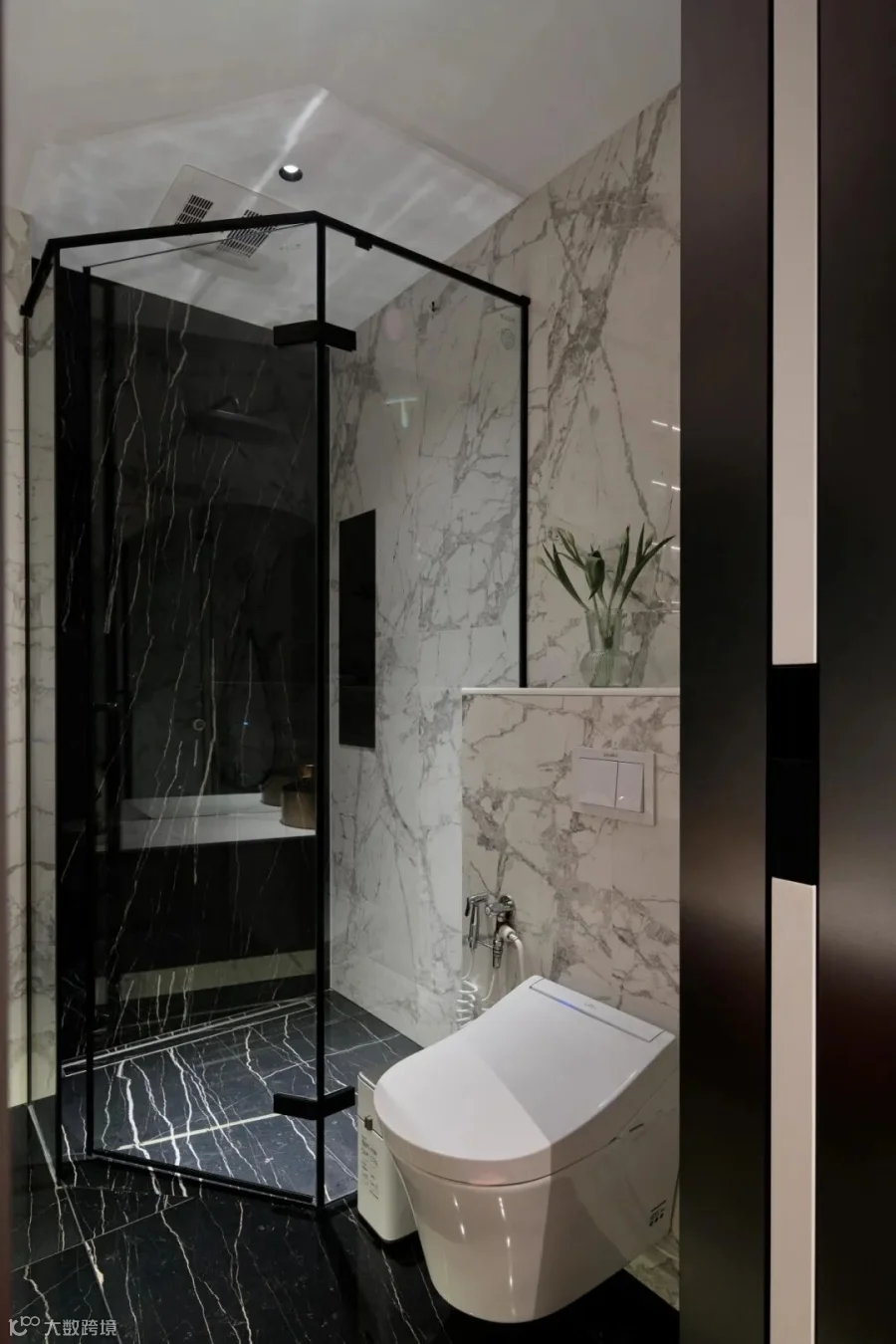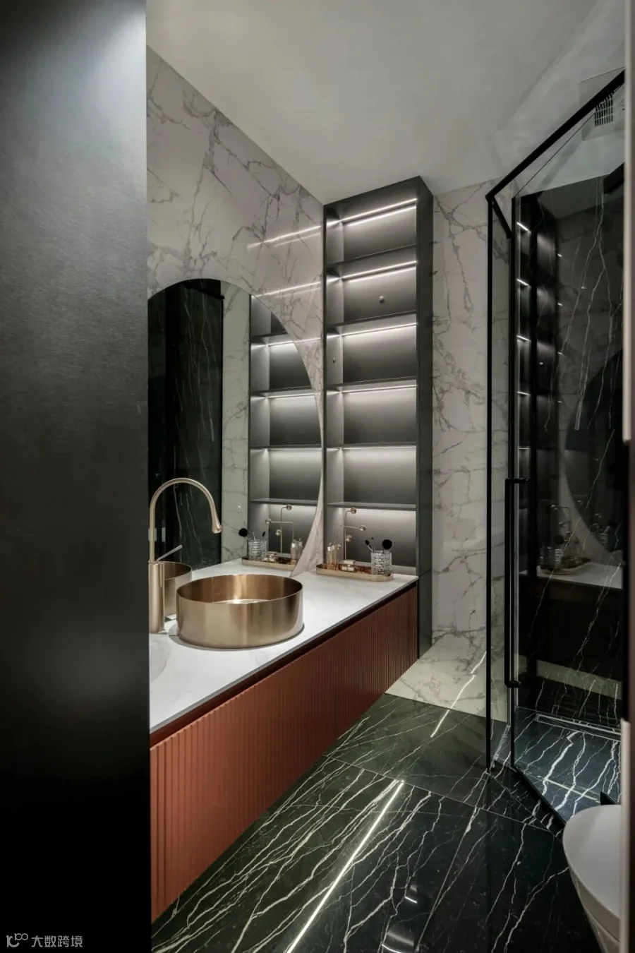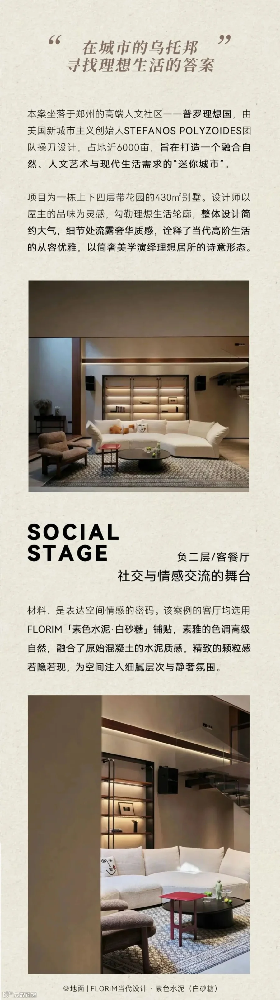 这是一栋上下四层带花园的430m别墅。设计师从屋主的品味中汲取灵感,塑造理想生活,整体设计简约大气,于细节中藏纳奢华,诠释了当代高阶生活的从客与优雅,以简奢美学演绎生活的理想居所。材料,是表达空间情感的密码。该案例地面大部分选用FLORIM「欧洲印象」铺贴,浅淡灰白的色调,随天然斑驳的肌理悄然延伸,为空间注入细腻层次与宁静氛围。清晨的阳光透过大面积落地窗倾泻而入,在灰白色的地面与沙发上留下柔和的光影纹路,把素雅的客厅蒙上一层电影质感,完美地诠释了舒适与美学的精妙平衡。厨房以纯净的白色调进一步强化极简主义的美学理念,白色的橱柜线条利落,搭配FLORIM「特级雪花自」背景,灰色的脉络在白色基底上肆意延展,为空间增添了一份灵动与随性,打破了纯色可能带来的单调感。优雅的FLORIM「奢金白」,从地面延伸至淋浴间墙面白色基底上交织着复古金与珍珠灰纹理,与极具韵律的FLORIM「交响乐」搭配,让空间视觉更显奢华与大气。黑白配色是永恒的经典。源自珍稀大理石的FLORIM「细花白」,灰色细花纹理犹如大雪过后雾凇的绽放,遇上深邃迷人的FLORIM「黑金」,白金色细纹划过黑底两者搭配形成反差碰撞,赋予空间别样的时尚魅力。郑州·理想国
