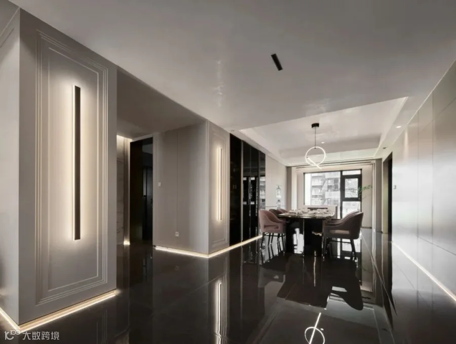 空间整体设计以轻奢风格作为主基调,同时融合了多种设计元素,这种独特的多元化混搭,并非随意堆砌各种风格元素,而是经过了细致的考量和精心的组合,使得各种元素能够高度契合,展现出一种和谐共生的美学效果,在保持轻奢风格的同时,也确保了空间的舒适性和安全性。
