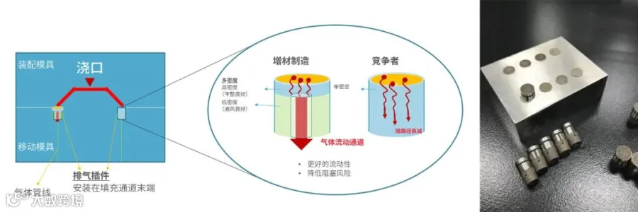排气对于注塑加工零件的产品质量的影响,至关重要。在加工过程中,模具内的气体需及时排出,否则会被压缩困于型腔中。如滞留的空气过热或承受熔体压力,可能会点燃氧气,导致塑料成品部件燃烧、出现光斑与应力裂纹,这通常被称为“柴油效应”(烧焦)。此外,通风不良叠加“柴油效应”会导致模具分型线磨损,注塑零件出现多余的塑料,即溢料。降低注射速度有助于空气从通风口排出,但这可能会带来其他问题,如充填不足,即在模具完全填满之前,塑料开始硬化。在较低温度下,熔体粘度增加,导致零件不能完全成型。一胜百的增材制造工艺能帮您解决这些问题。