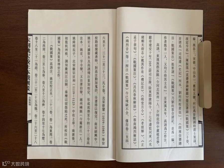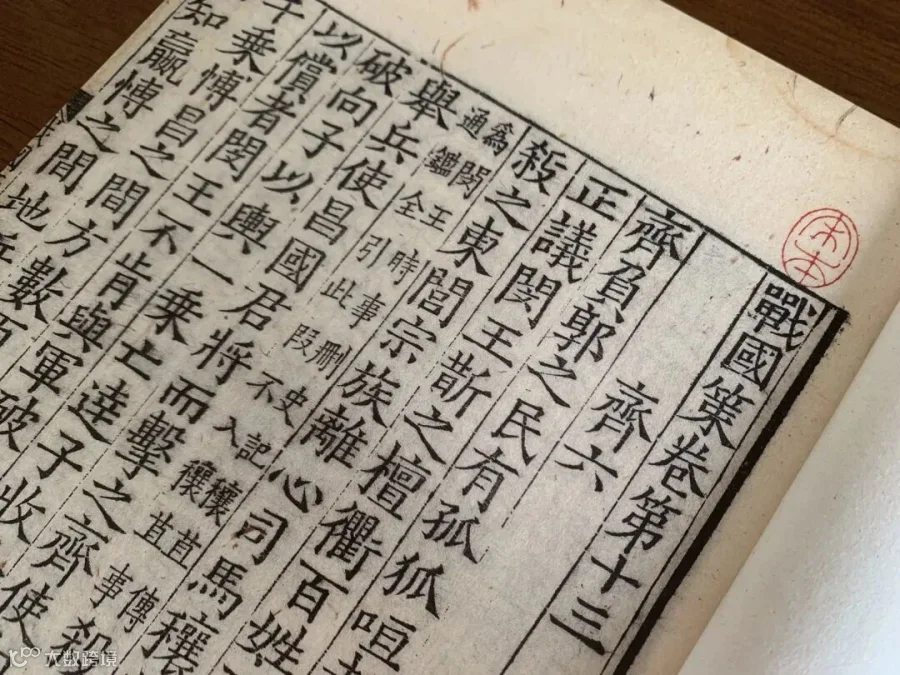 到了南宋绍兴中,姚宏发现《战国策》旧本未经曾巩校定的固然舛误不可读,就是根据曾巩校定刊刻的临安、建阳诸本,也各有得失。他广泛收集诸家校本,经过详加比勘,完成了一个新校本,这就是流传至今的三十三卷高诱注本。姚宏,字令声,又自署伯声,越州嵊县(今属浙江)人,姚舜明长子。北宋徽宗宣和中在上庠,南渡后,初监杭州税,调知衢州江山县。秦桧以宿怨陷之死。姚宏校本后序落款,写于“绍兴丙寅中秋”,即绍兴十六年。姚宏校本宋刻今存,就是现在影印的这个版本。框高22.2厘米,宽14.3厘米,十一行,行二十字。白口,左右双边。典型的浙刻字体,近似欧阳询,古朴劲拔。根据书中宋讳至“构”字,判断应刻于绍兴十六年至三十二年间;刻工如陈锡、王珍、徐亮、毛昌、徐杲、毛谅、洪先、朱明、徐章、李彦、陈明俊等,皆南宋初年杭州地区良工,应刻于杭州地区。这是姚宏校本《战国策》的现存最早刻本,也许就是姚校的第一个刻本。