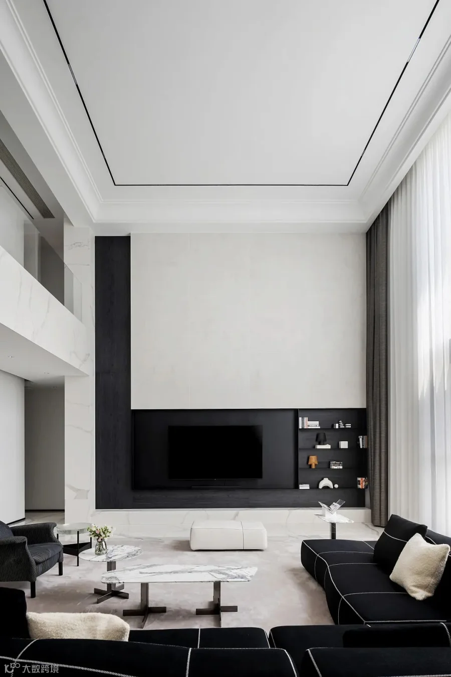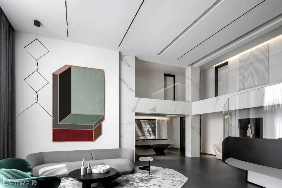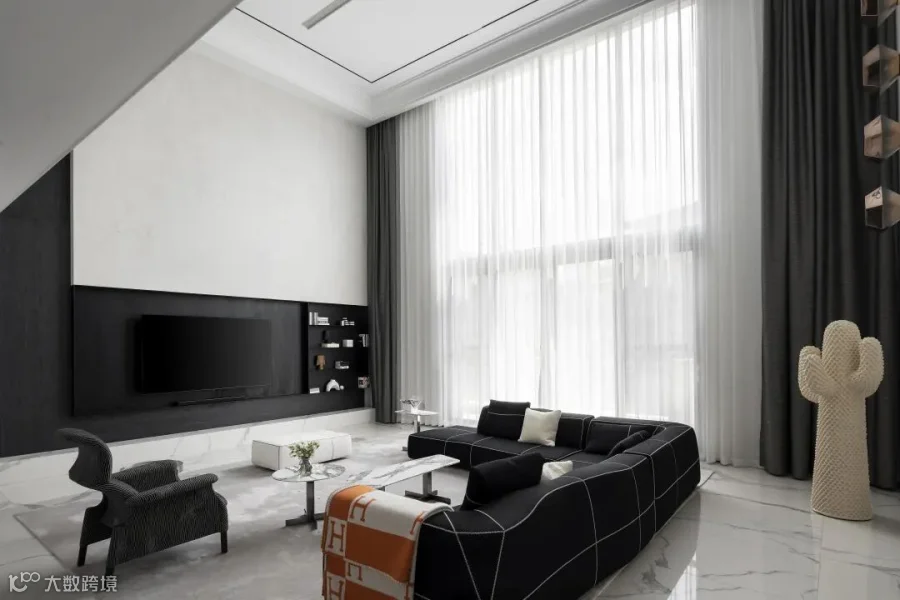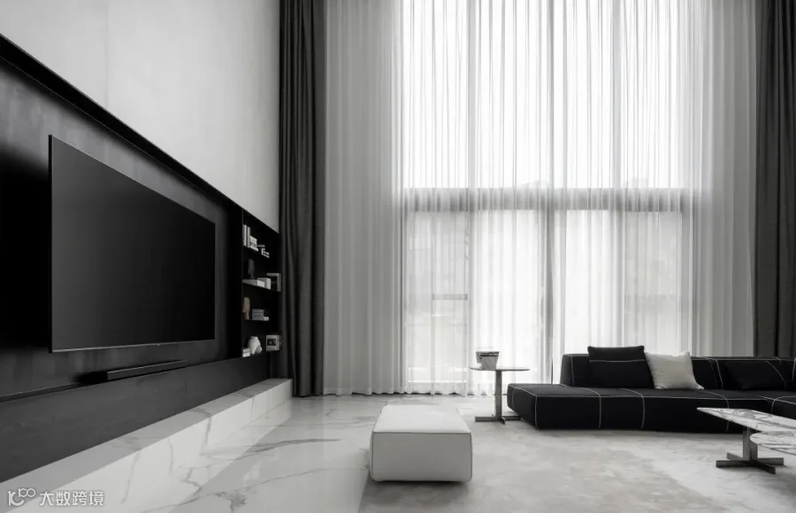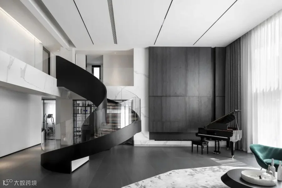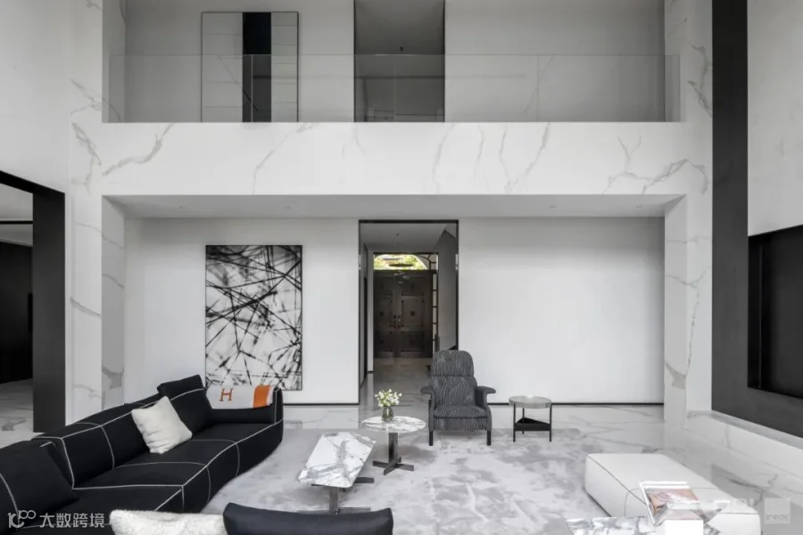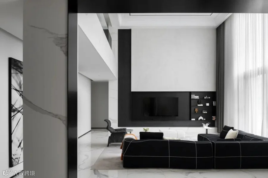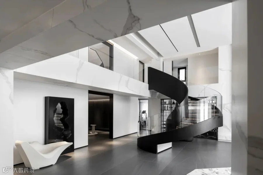 两层挑高的客厅,阔卓的尺度,呈现大气的视觉感观。黑白灰的极简设计,精致的线条搭配极具奢华感,自然氛围悄然流露,散发出空间独特的气质。