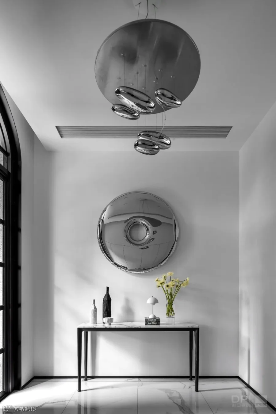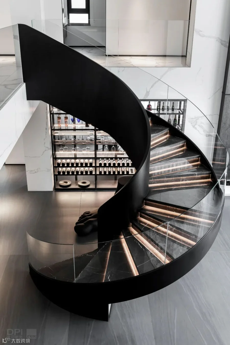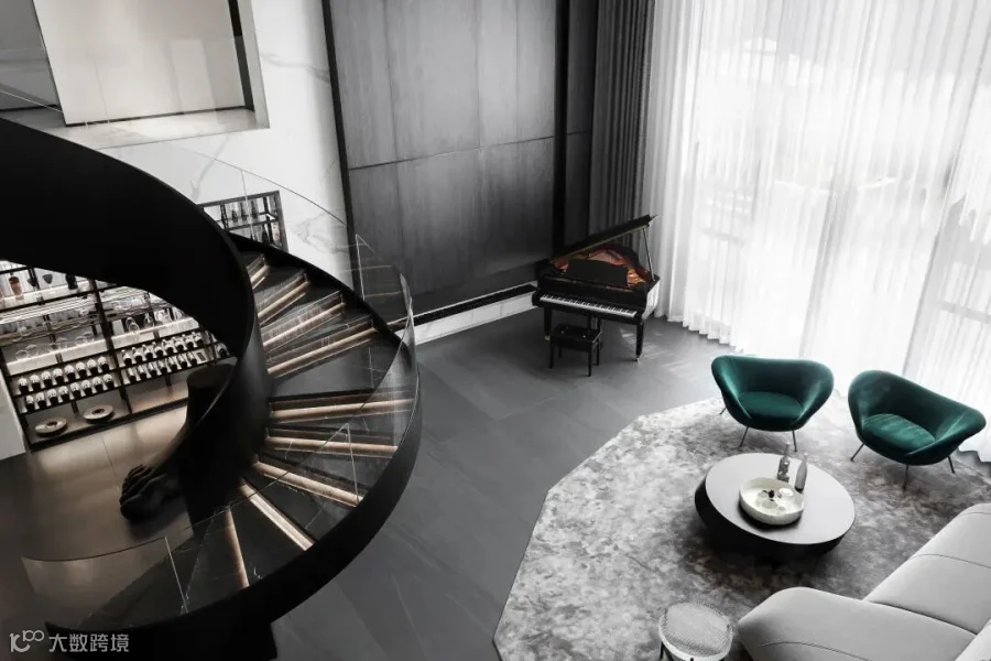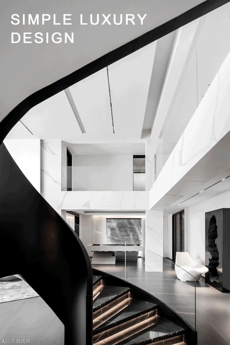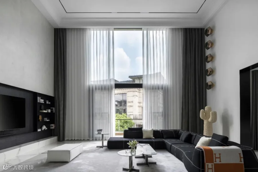 两层挑高的客厅,阔卓的尺度,呈现大气的视觉感观。黑白灰的极简设计,精致的线条搭配极具奢华感,自然氛围悄然流露,散发出空间独特的气质。