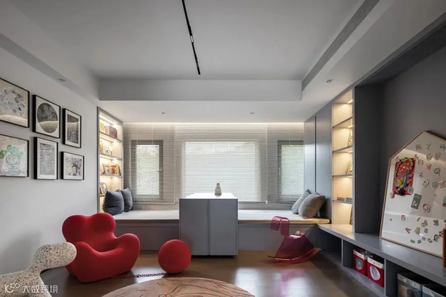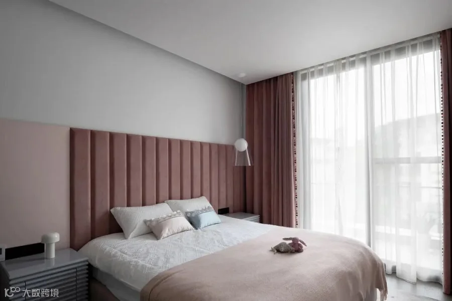公主房是本案最具色彩的房间,一改整体的黑白灰格调,选用柔和百搭的豆沙粉,舒适柔和的莫兰迪色,呈现少女心的娇憨。