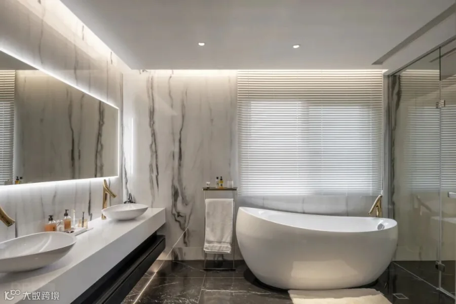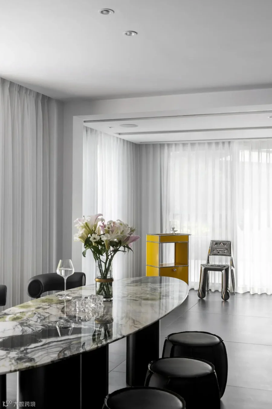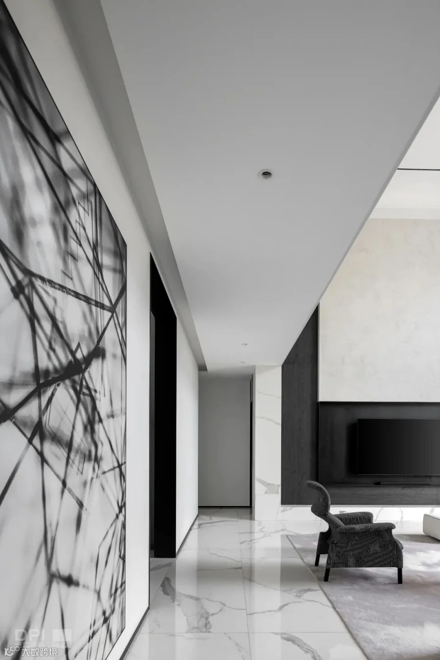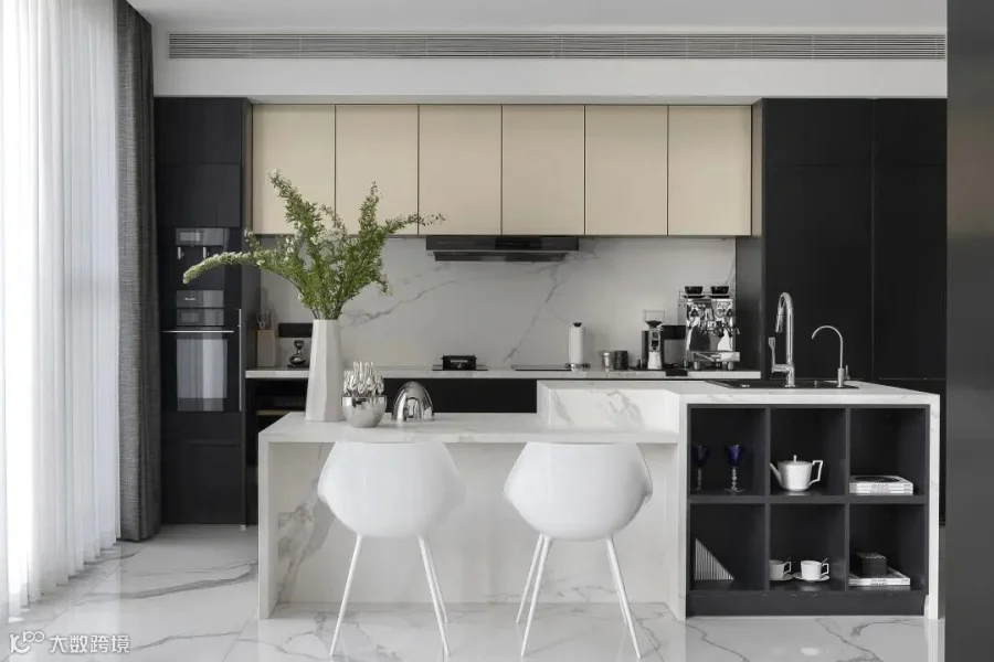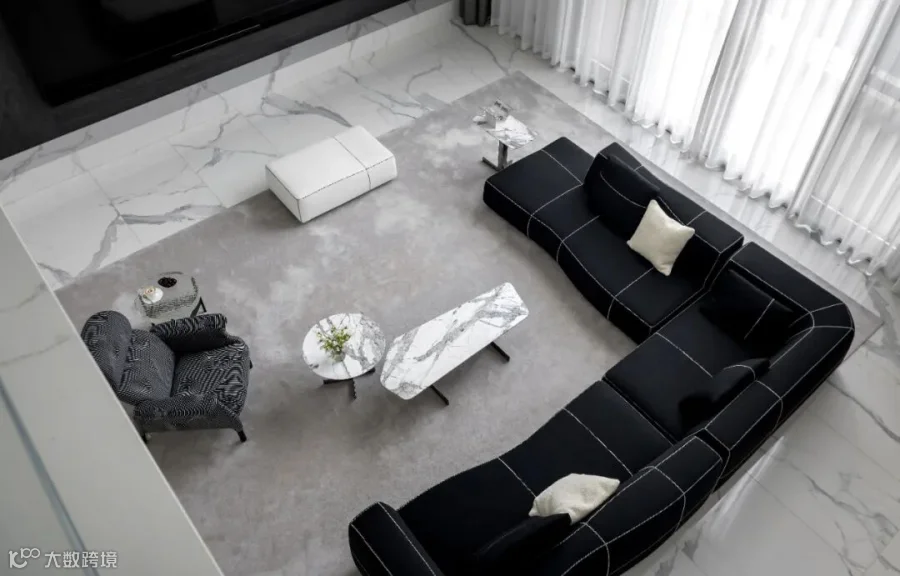 本案选用了rex特级雪花白,源自卡拉卡塔,经典的黑白组合,高贵的白色石纹,纯正的黑色线条,极致和永恒。现代简约的视觉,描绘出沉稳大气又不失温馨舒适的空间感受,没有繁花似锦,唯有灰白刻画的原生之美,缔造了空间永不过时的品味与格调。